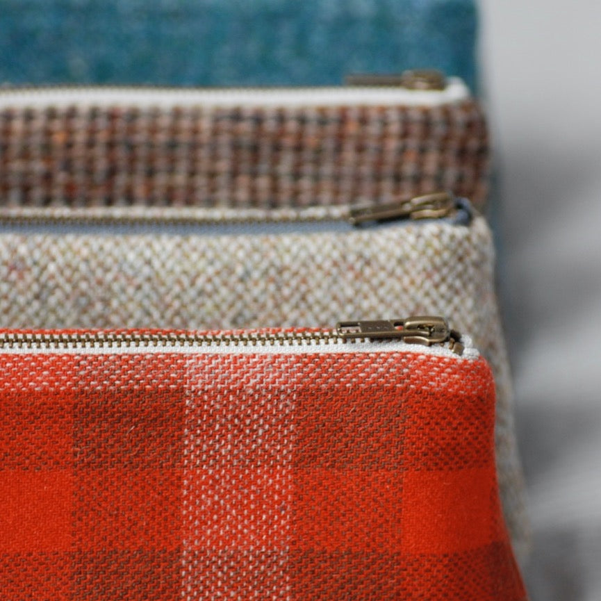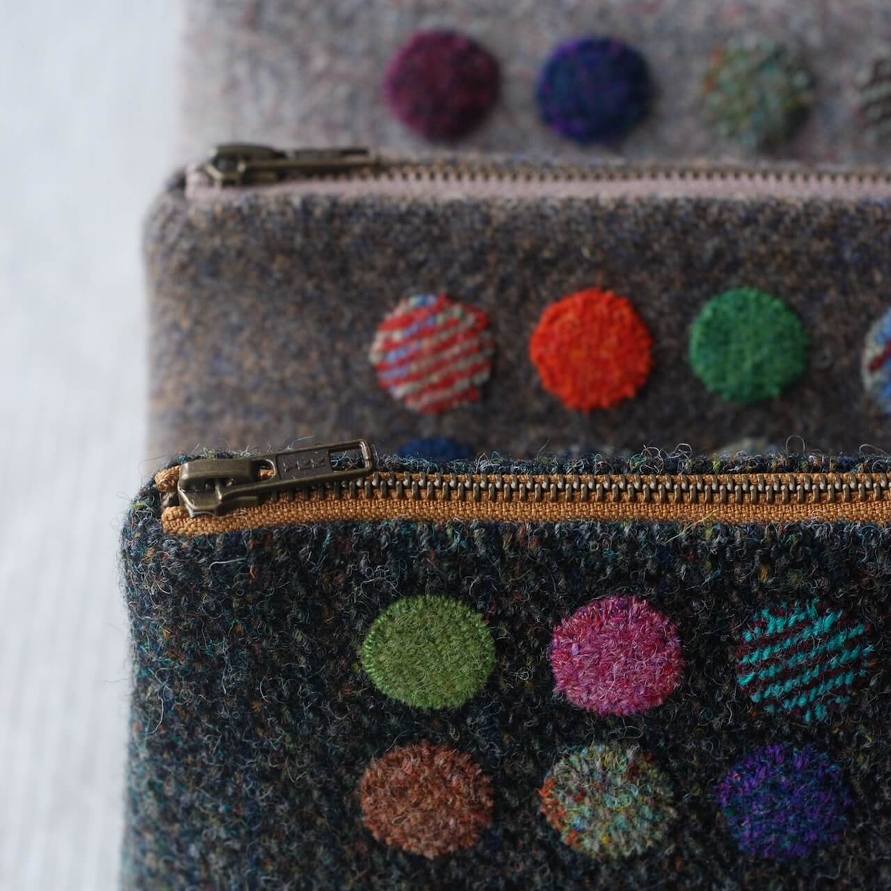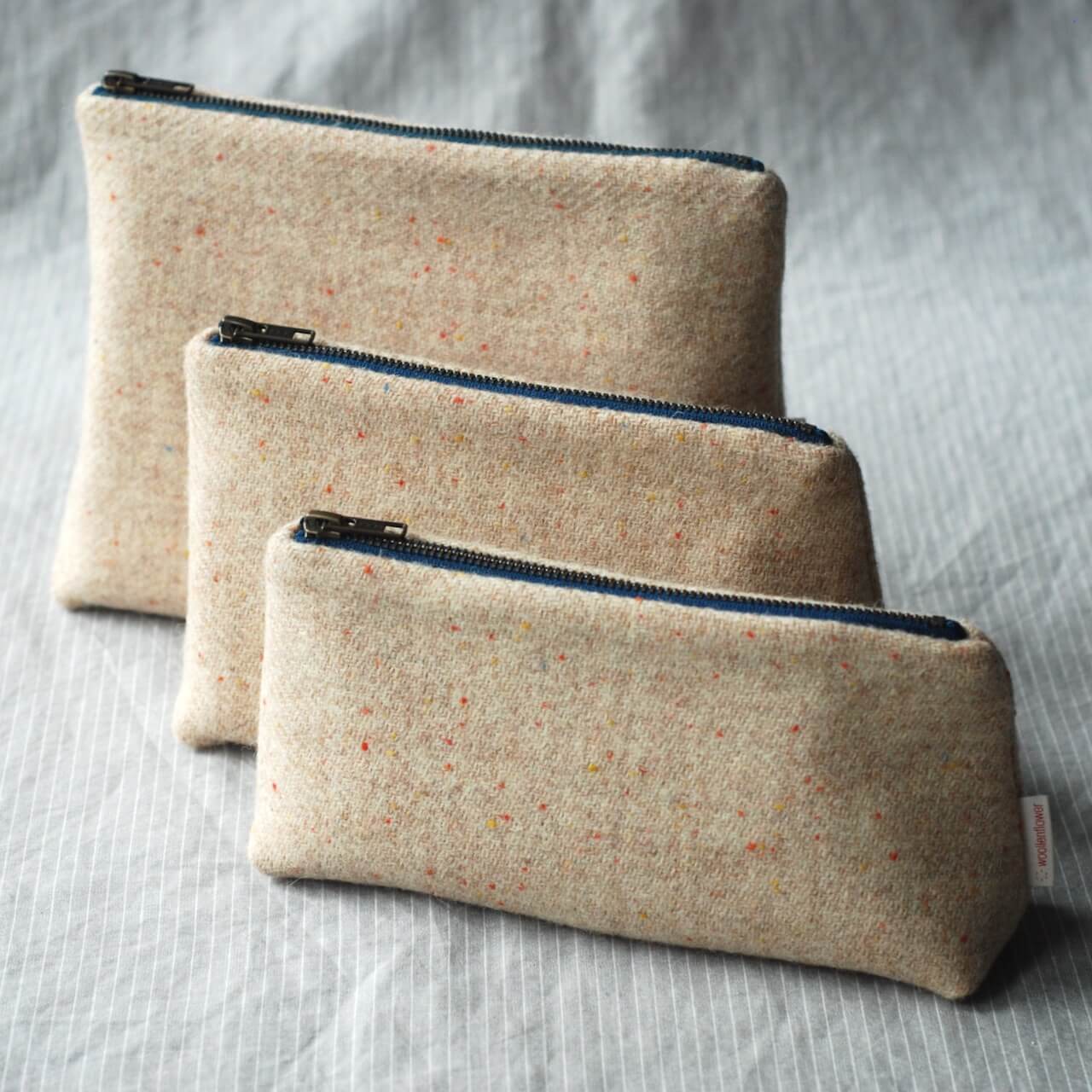 Wool pouches made from fabrics reclaimed from worn-out garments, upholsterer’s waste and vintage lengths.